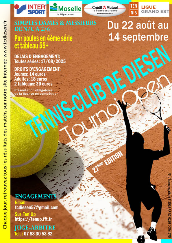 Ce tournoi est réservé à tous les membres du TC Diesen à jour de leur cotisations. Cette compétition est homologuée sous le numéro T 2024 55 57 0220 004.